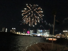 クルーズ終盤にさしかかると、19:00から約5分間、東京港の澄み渡る冬の夜空にダイナミックな華が咲く花火がお台場レインボーブリッジ付近に打ち上がります。船内2階席に通じる外部デッキなどで臨場感あふれる打ち上げ花火をご堪能ください。