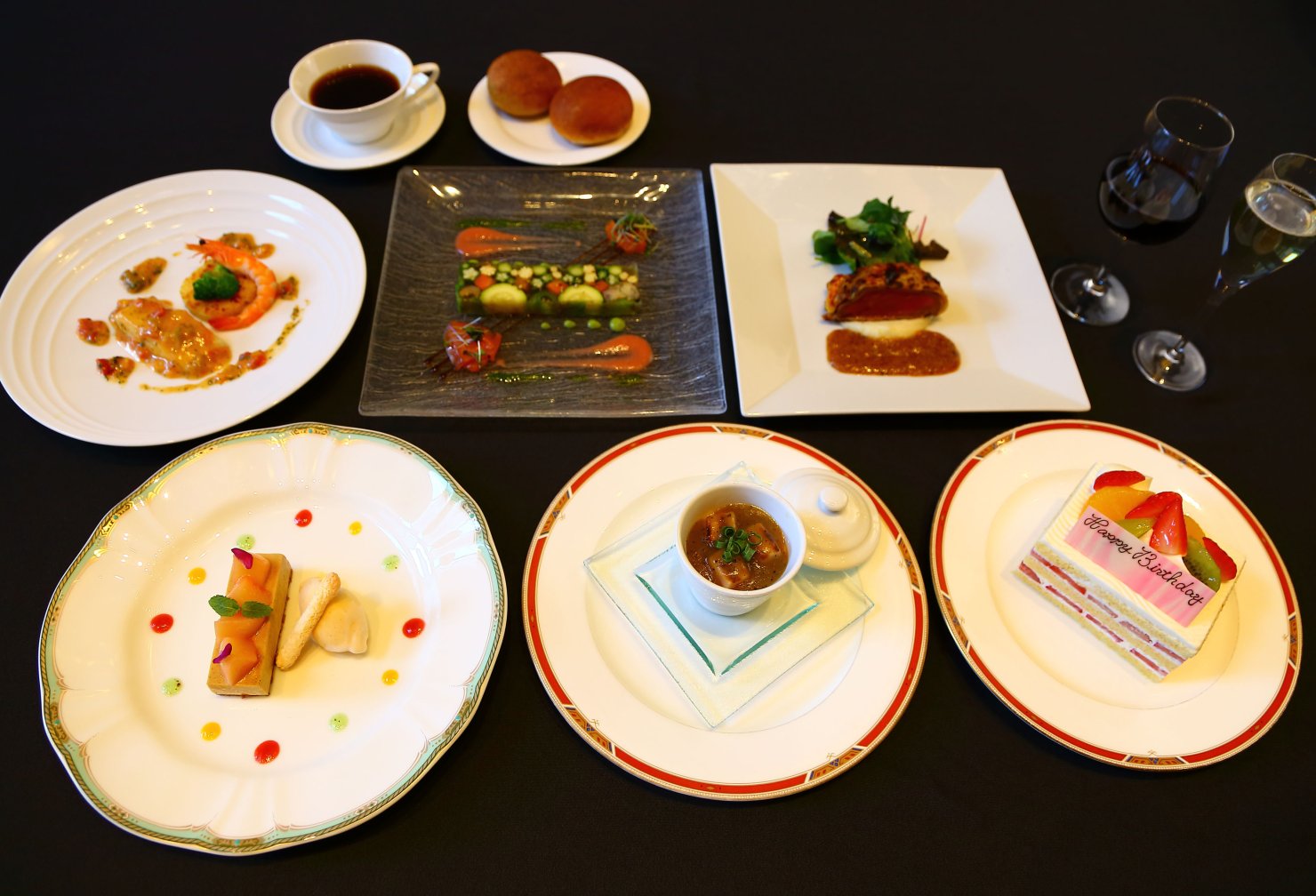 旬な食材を使った繊細なフレンチコースをスパークリングワイン・白ワイン・赤ワインからチョイス可能な3杯のドリンクと、デザート時に提供される、短めのお祝いメッセージを入れられる特製ケーキとともに、船上での幸あるお祝いディナーをどうぞお楽しみください。