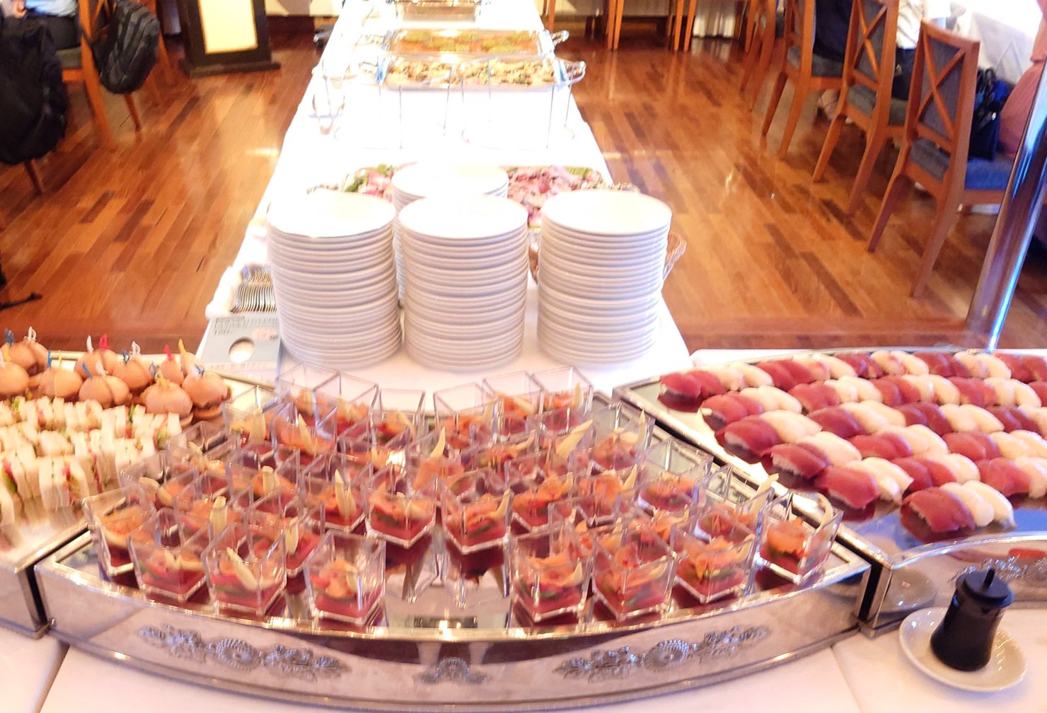 ◆ビュッフェ料理は船内厨房から出来立てご用意します。冷製料理約6品・温製料理約8品・プチデザート3種・コーヒー・ティーを予定しております。