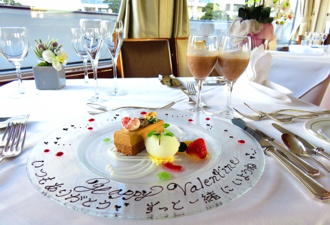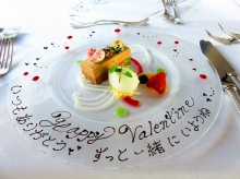 2月8日~14日までの期間限定サービスとしてコースのデザートのお皿に全35文字程度までのメッセージが入れられます。