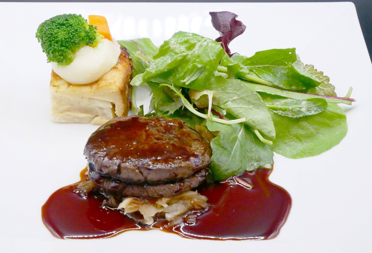 グリーンアスパラ グレイビーソース Japanese Beef Filet Steak and Green Asparagus with Gravy Sauce - 苺のミルクレープ 北海道産牛乳シャーベット Strawberry Mille-crepe and Hokkaido Milk Sorbet